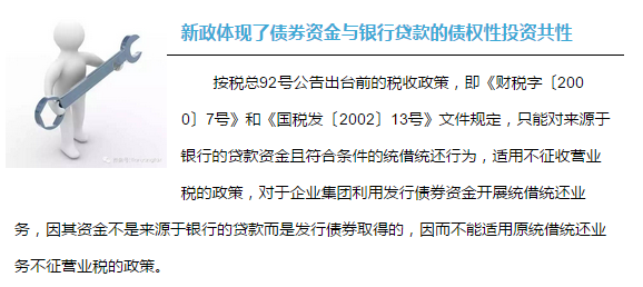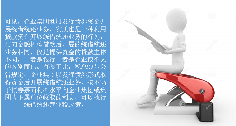 隨著金融市場發(fā)展,近年來,一些企業(yè)集團采取發(fā)行債券的形式取得資金,并在企業(yè)集團內(nèi)部開展統(tǒng)借統(tǒng)還業(yè)務(wù),其實質(zhì)與向金融機構(gòu)借款后開展的統(tǒng)借統(tǒng)還業(yè)務(wù)相同。但由于原先政策的規(guī)定只包含了從金融機構(gòu)借款后的符合條件的統(tǒng)借統(tǒng)還業(yè)務(wù)才能享受不征收營業(yè)稅的政策,在這種情況下稅企爭議不斷,正是在這種背景下,稅總92號公告第一條對企業(yè)集團利用發(fā)行債券資金開展統(tǒng)借統(tǒng)還業(yè)務(wù)涉及的營業(yè)稅問題,予以了明確:企業(yè)集團或企業(yè)集團中的核心企業(yè)以發(fā)行債券形式取得資金后,直接或委托企業(yè)集團所屬財務(wù)公司開展統(tǒng)借統(tǒng)還業(yè)務(wù)時,按不高于債券票面利率水平向企業(yè)集團或集團內(nèi)下屬單位收取的利息,比照《財稅字〔2000〕7號》和《國稅發(fā)〔2002〕13號》政策,不征收營業(yè)稅。
