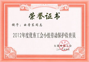 [li]2013年4月,在總結(jié)上年度安康杯競賽活動期間,我所工會安全員曲晉東獲市總工會頒發(fā)的“2012年度優(yōu)秀工會小組勞動保護檢查員”證書。[/li]